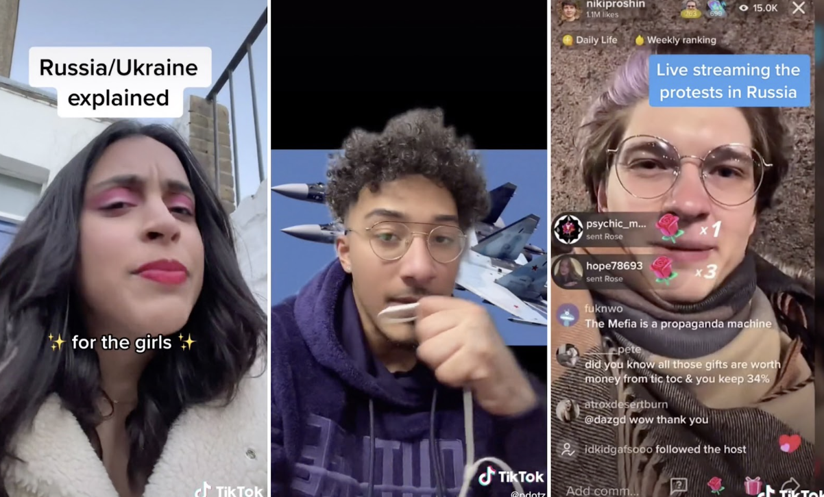 TikTok creators explaining and livestreaming the Russia–Ukraine conflict in early 2022. The vertical format, captions, and comment streams illustrate how war was mediated through platform-specific narrative styles. Source: The Guardian.